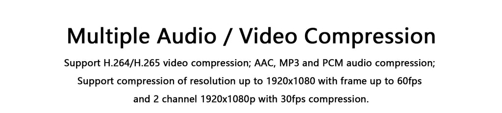 ●【Multiple Audio / Video Compression】Support H.264/H.265 video compression; AAC, MP3 and PCM audio compression.
